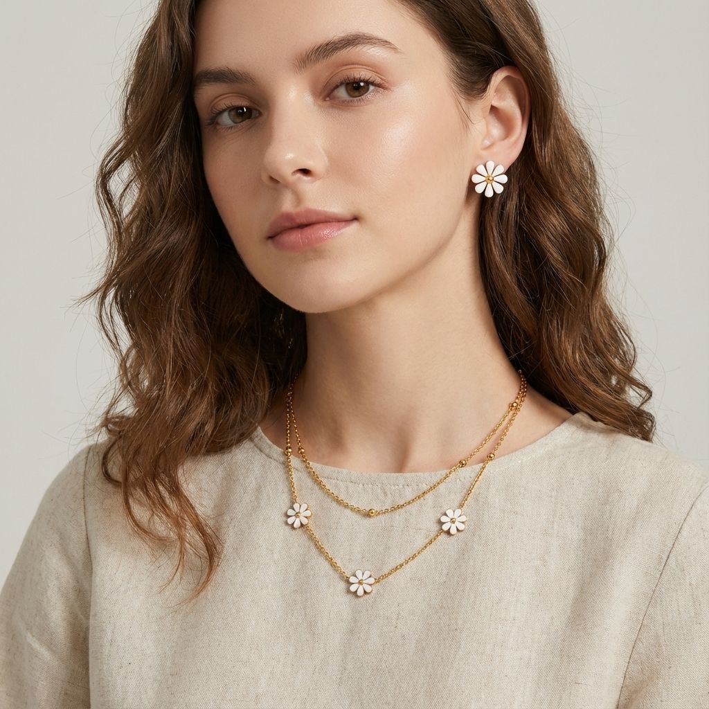 MYKI White Daisy Floral Premium Plated Necklace & Stud Earrings (mkps58)